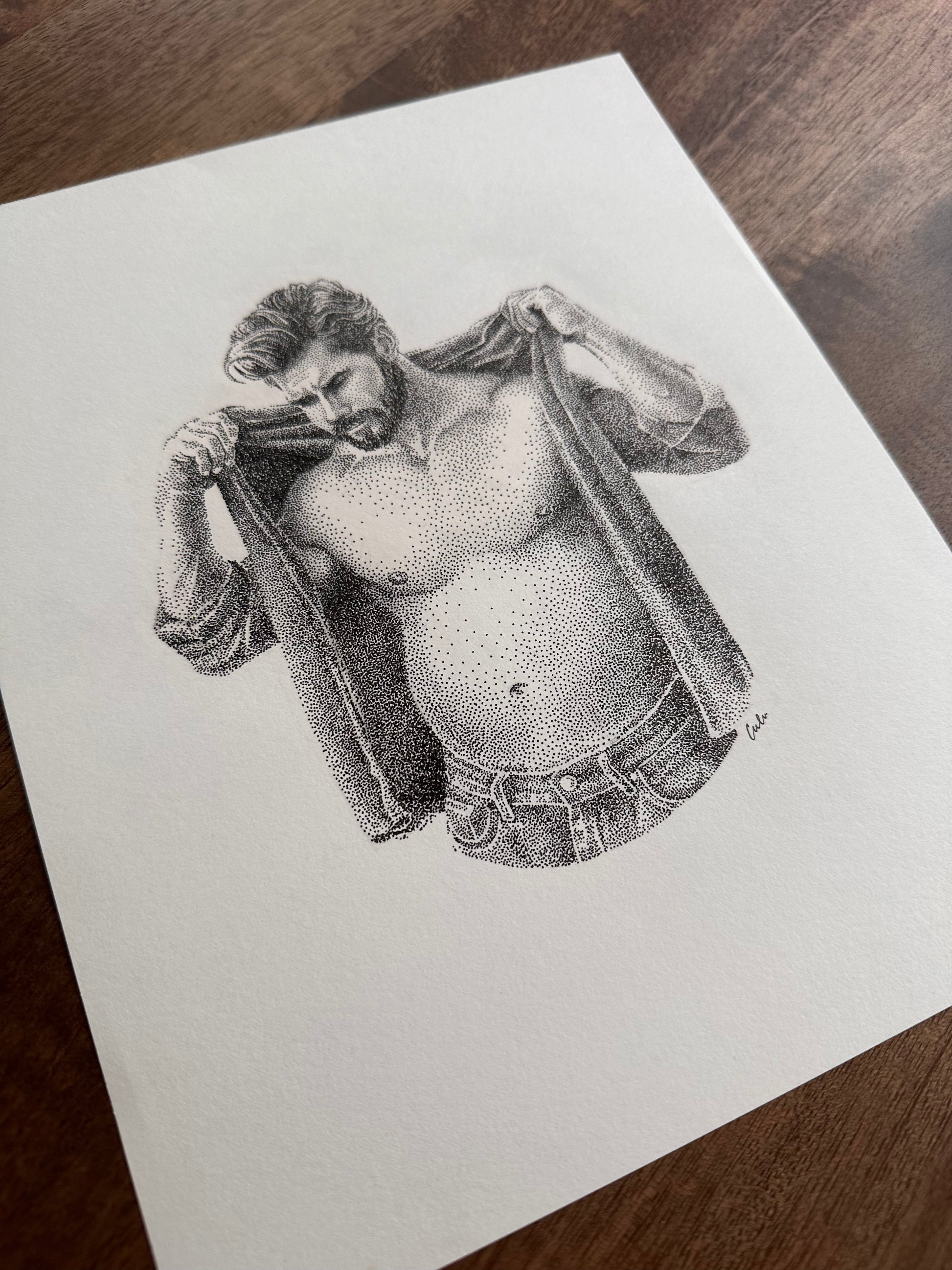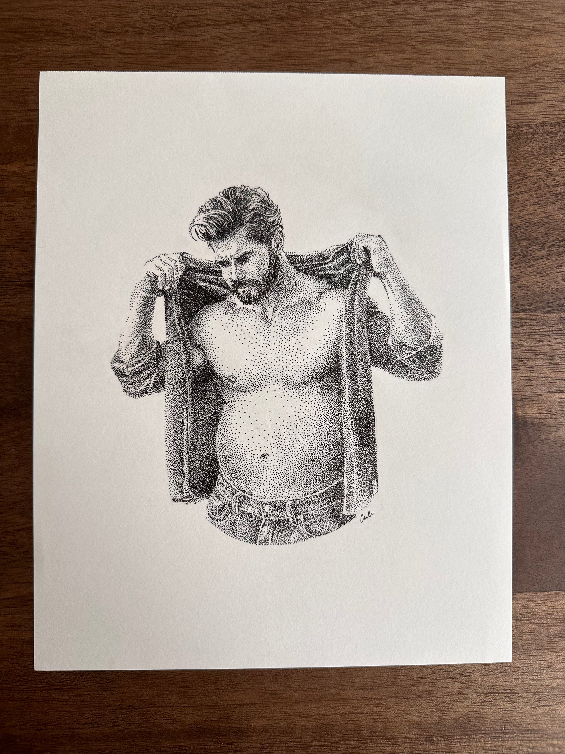 The piece is hand drawn with micron pens on 8x10 inch paper. On slightly off white drawing paper (most of drawings appears on slightly off white color paper). Drawn in 2024