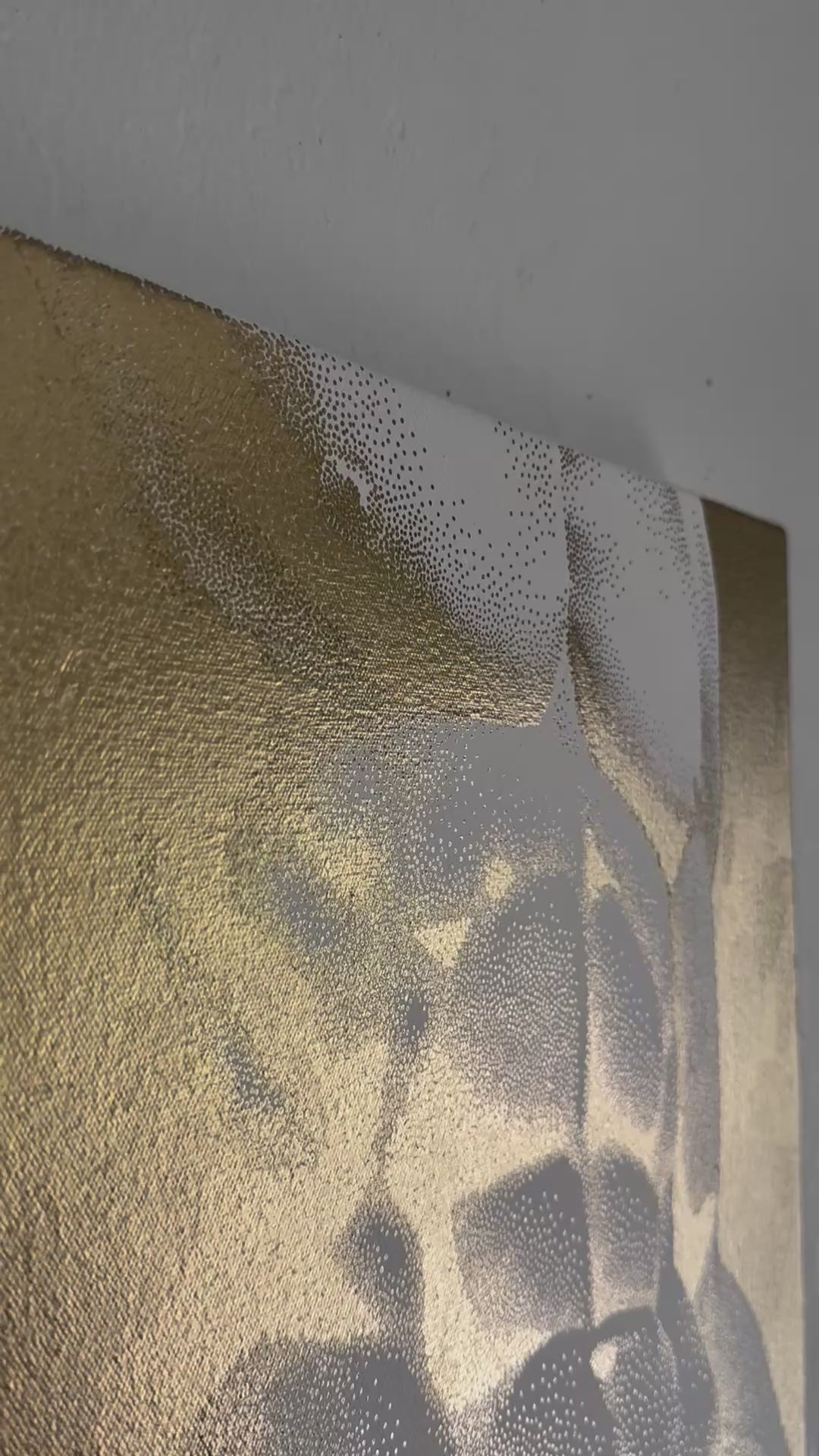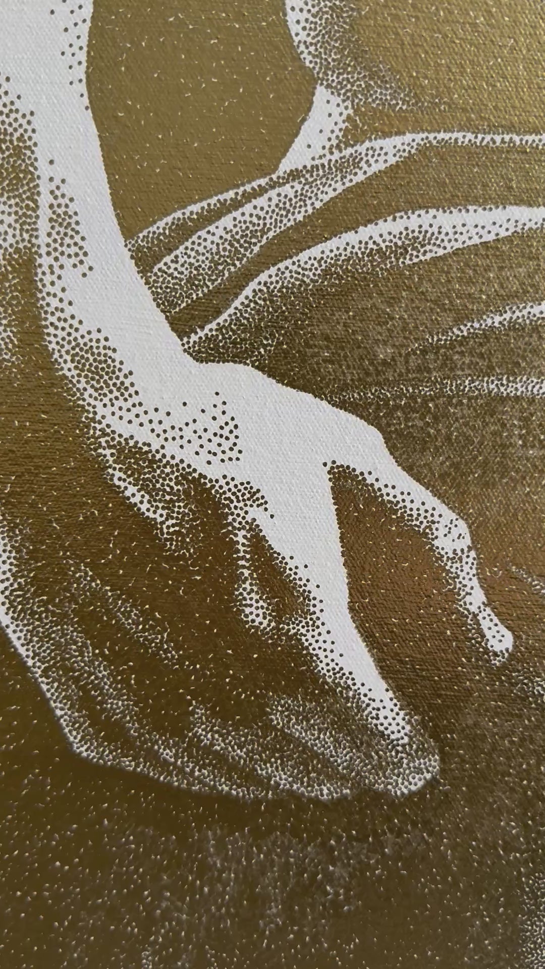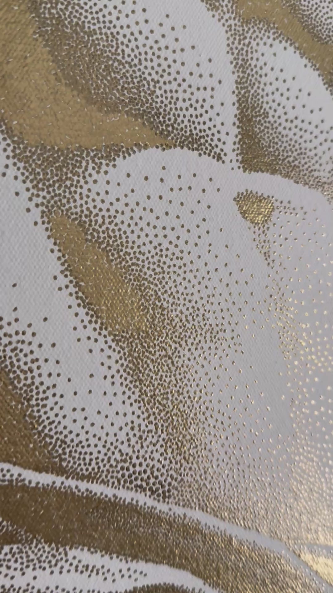 The piece is hand painted on an 18x24 canvas that's 1.5 inches thick. The dotwork is done in gold dotwork art. photos and videos are unedited. Completed in October 2024