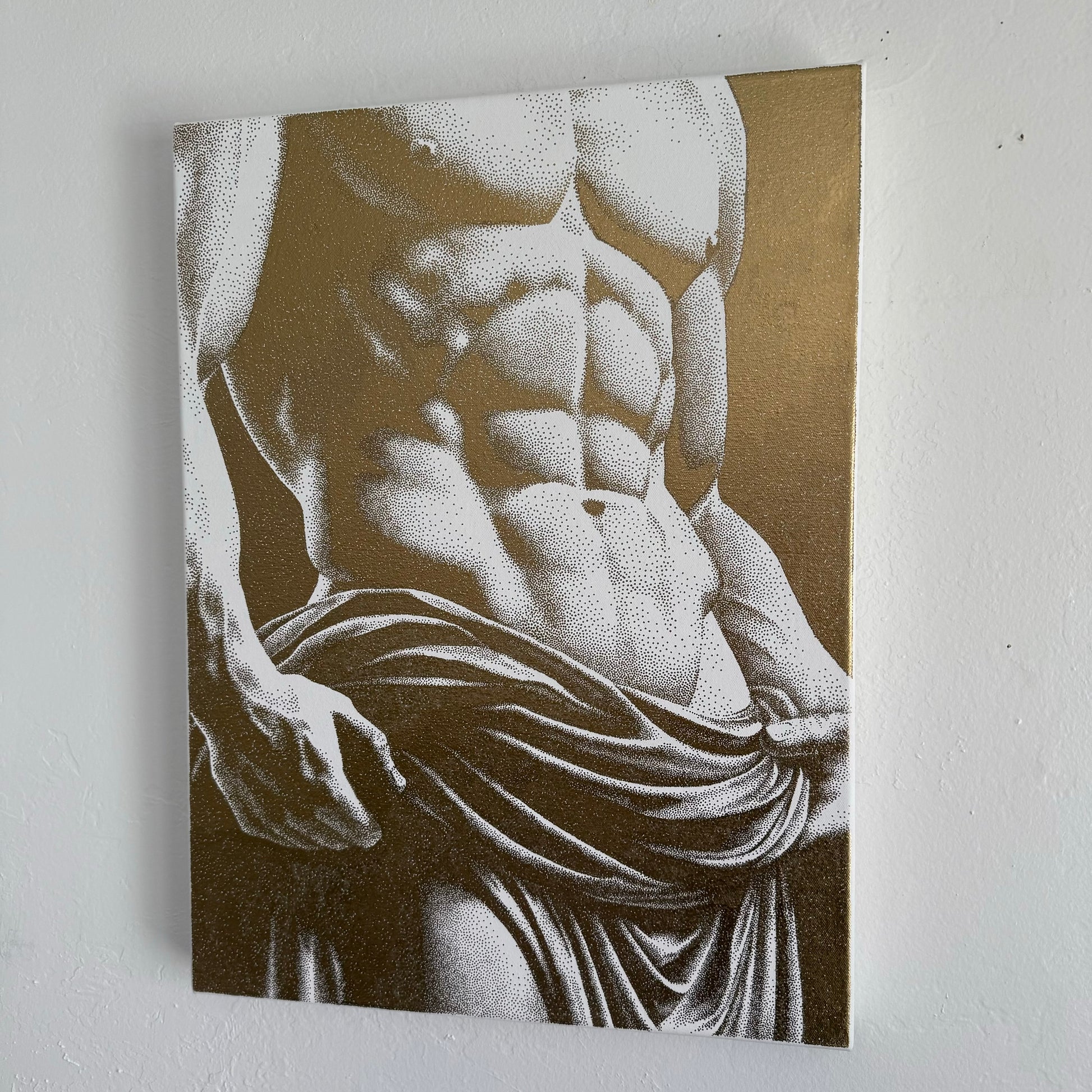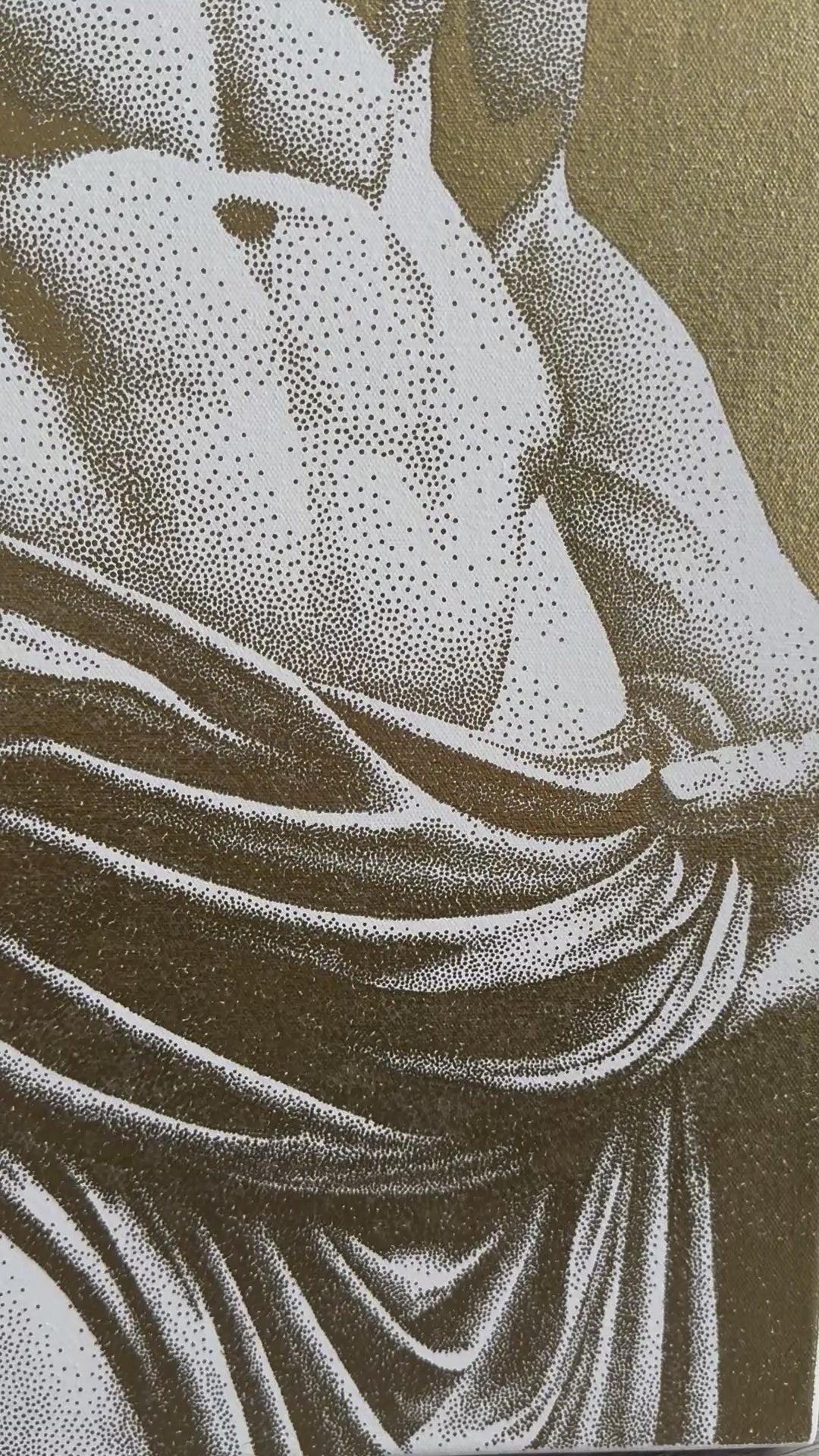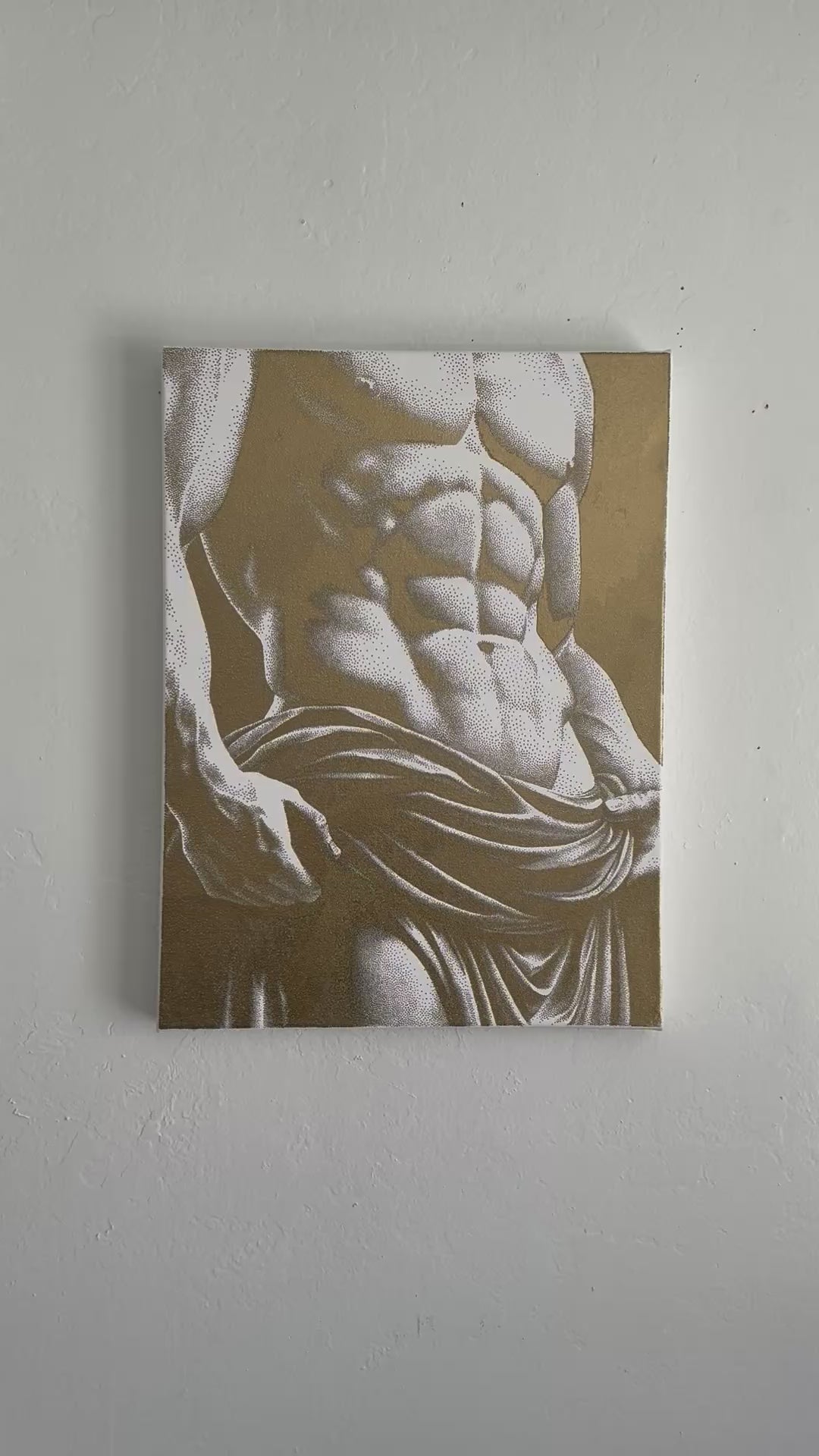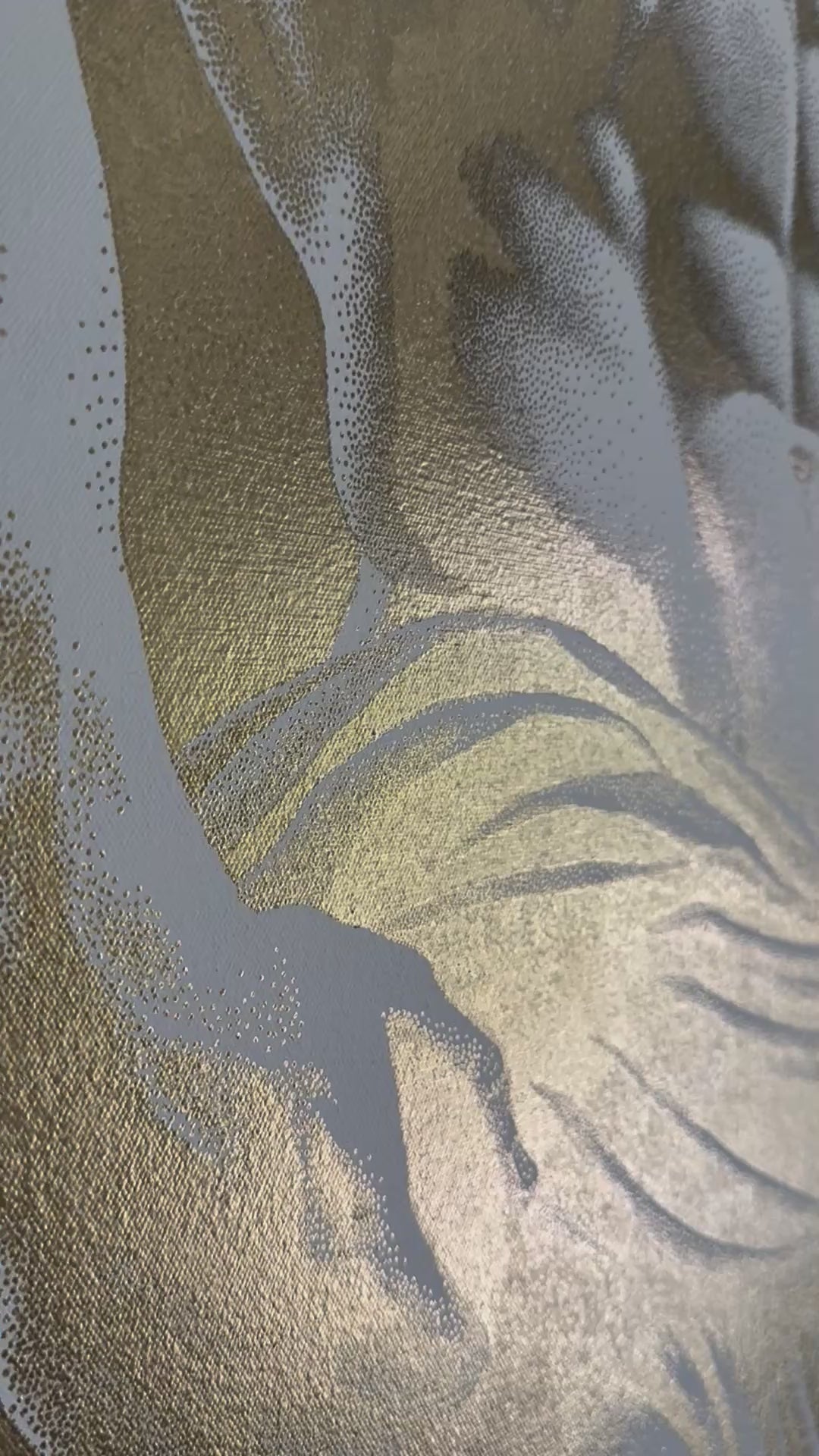 The piece is hand painted on an 18x24 canvas that's 1.5 inches thick. The dotwork is done in gold dotwork art. photos and videos are unedited. Completed in October 2024