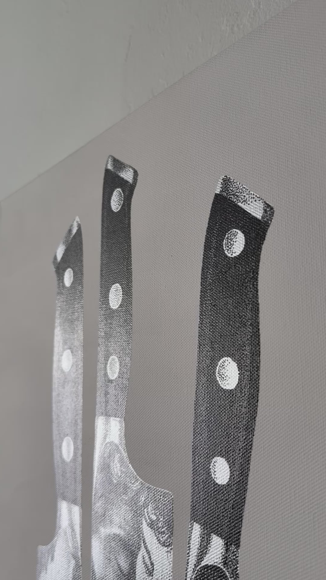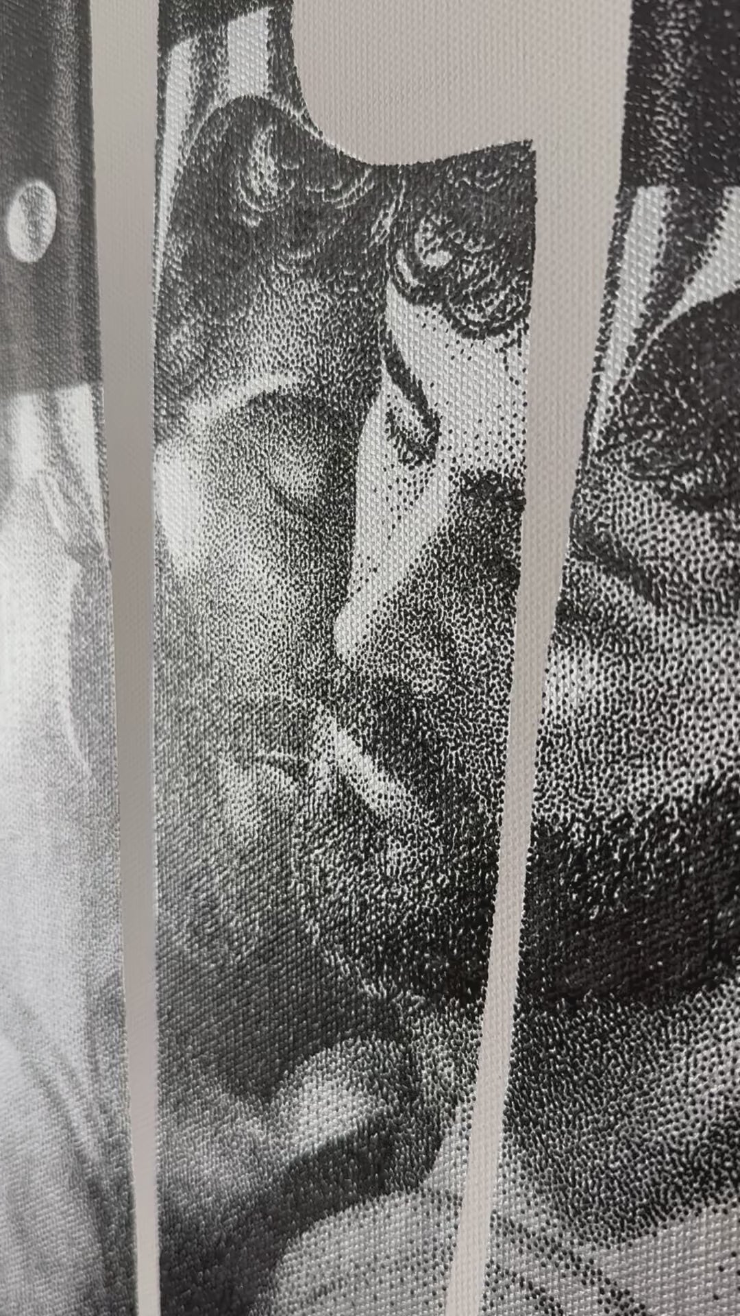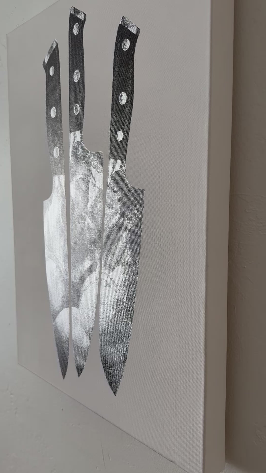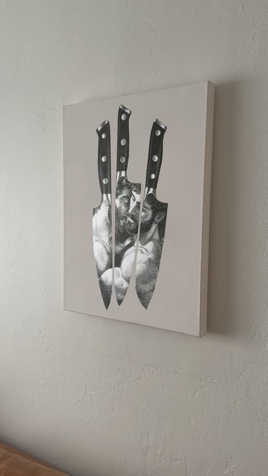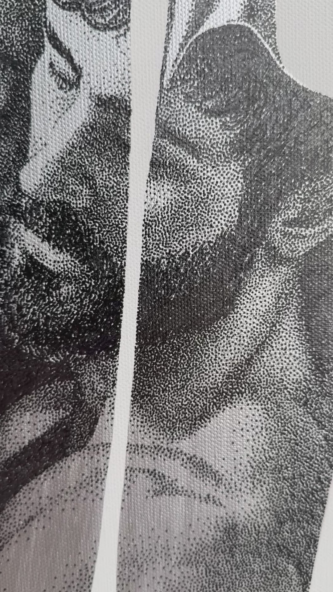 The piece is hand painted on an 18x24 canvas that's 1.5 inches thick. The dotwork is done in black paint on top of a silver background. photos and videos are unedited.