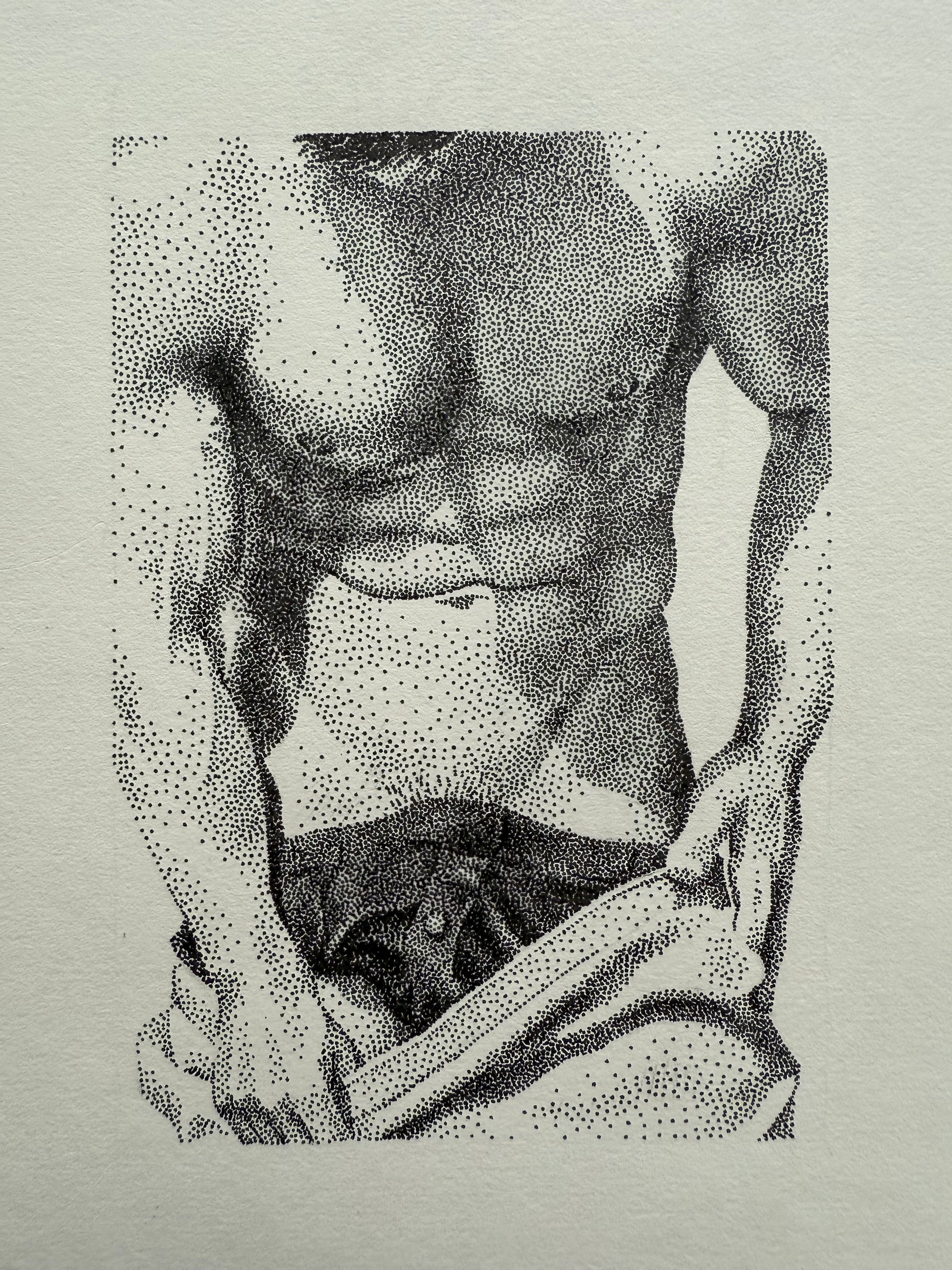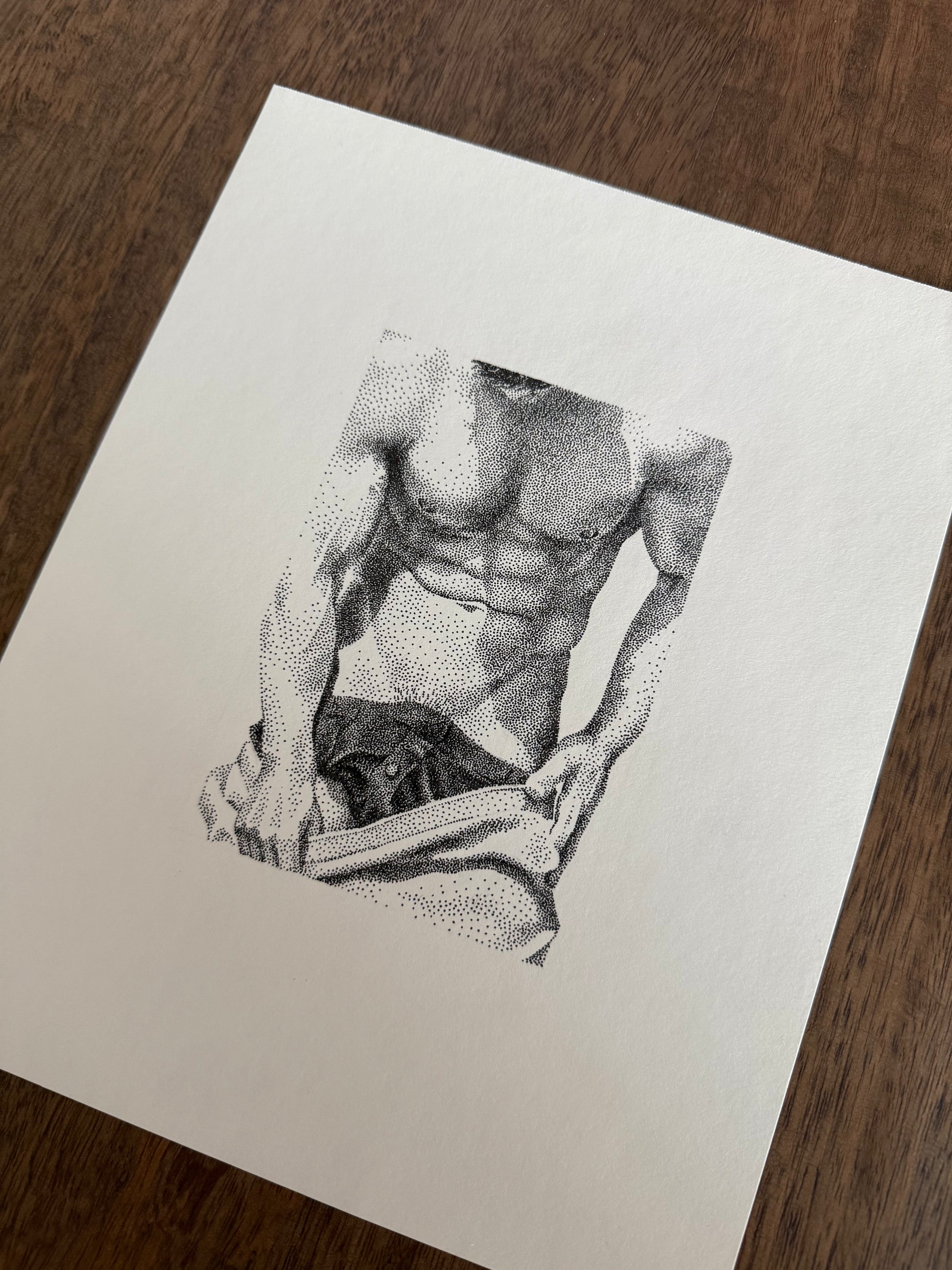 The piece is hand drawn with micron pens on 8x10 inch paper. On slightly off white drawing paper (most of drawings appears on slightly off white color paper). Drawn in 2025